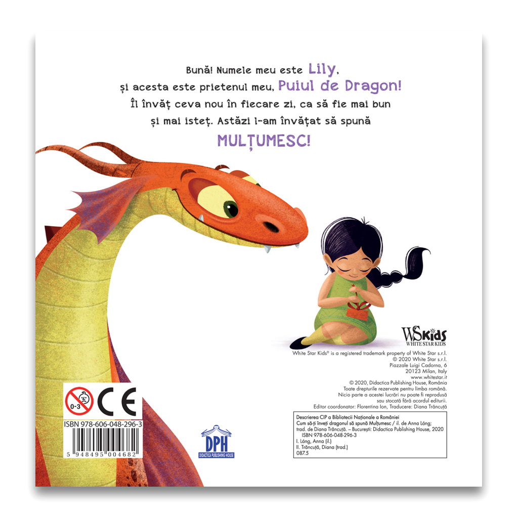 Cum sa-ti inveti dragonul sa spuna MULTUMESC, o carte care ii invita pe copii sa descopere cum a invatat puiul de dragon sa spuna MULTUMESC. Astazi este o zi speciala – este ziua de nastere a puiului de dragon. In timp ce el doarme, Lily ii pregateste o mare surpriza. Afara il asteapta prietenii lui, un munte de cadouri si masa plina cu prajiturile preferate. Aflati cum Lily ii arata puiului de dragon sa fie politicos si descoperiti cum il invata sa spuna cuvantul magic MULTUMESC.