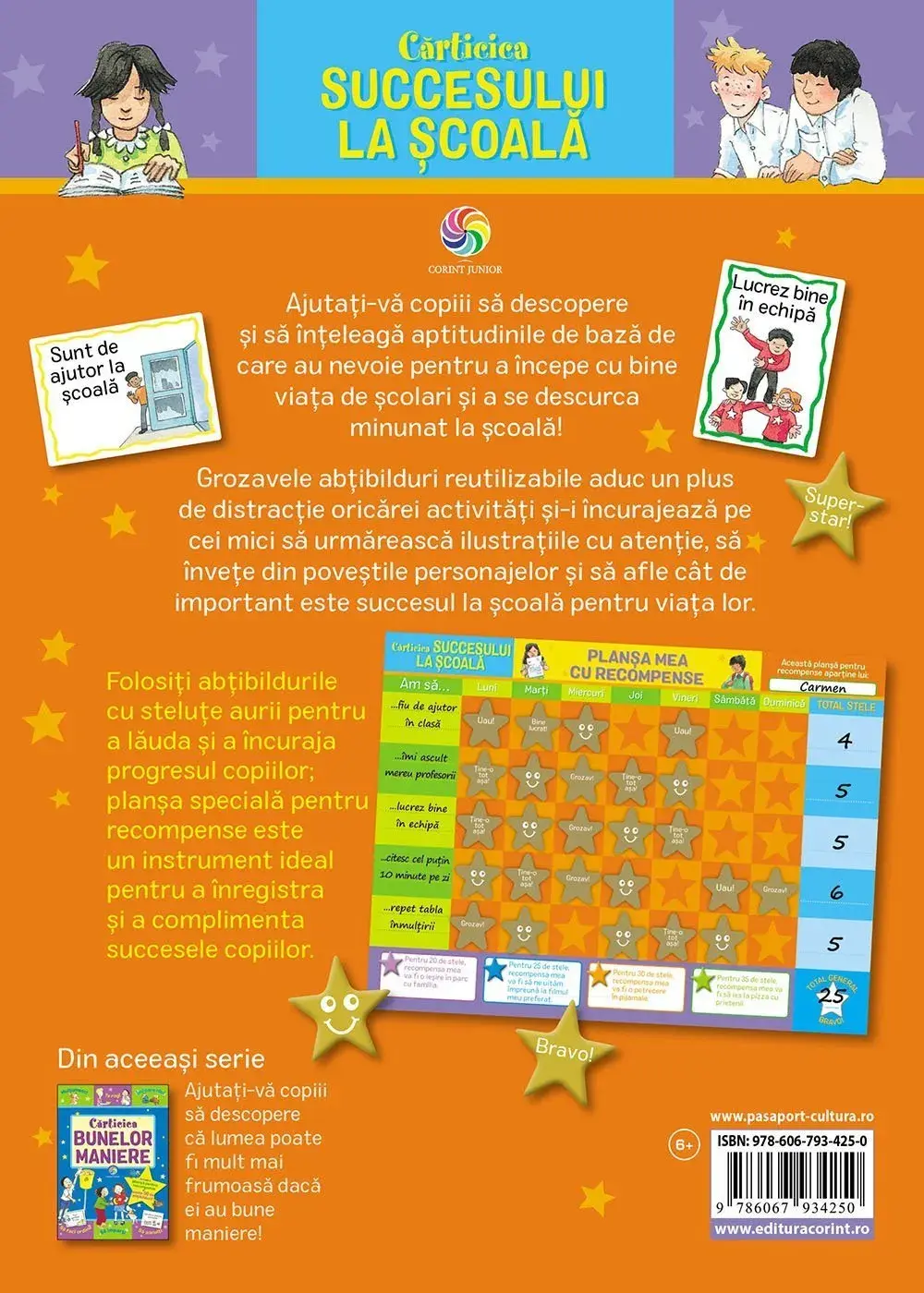 Ajutati-va copiii sa descopere si sa inteleaga aptitudinile de baza de care au nevoie pentru a incepe cu bine viata de scolari si a se descurca minunat la scoala! Grozavele abtibilduri reutilizabile aduc un plus de distractie oricarei activitati si-i incurajeaza pe cei mici sa urmareasca ilustratiile cu atentie, sa invete din povestile personajelor si sa afle cat de important este succesul la scoala pentru viata lor. Folositi abtibildurile cu stelute aurii pentru a lauda si a incuraja progresul copiilor; plansa speciala pentru recompense este un instrument ideal pentru a inregistra si a complimenta succesele copiilor. AUTOR: SOPHIE GILESTIP COPERTA: FLEXICOVERISBN: 9786067934250FORMAT: 16.5 x 23 cmEDITURA: CORINTAN APARITIE: 2018NUMAR PAGINI: 37