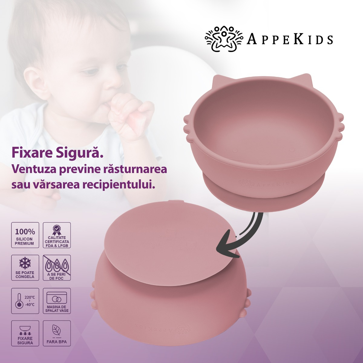 Bol din silicon, AppeKids, Kitty I - Old Rose