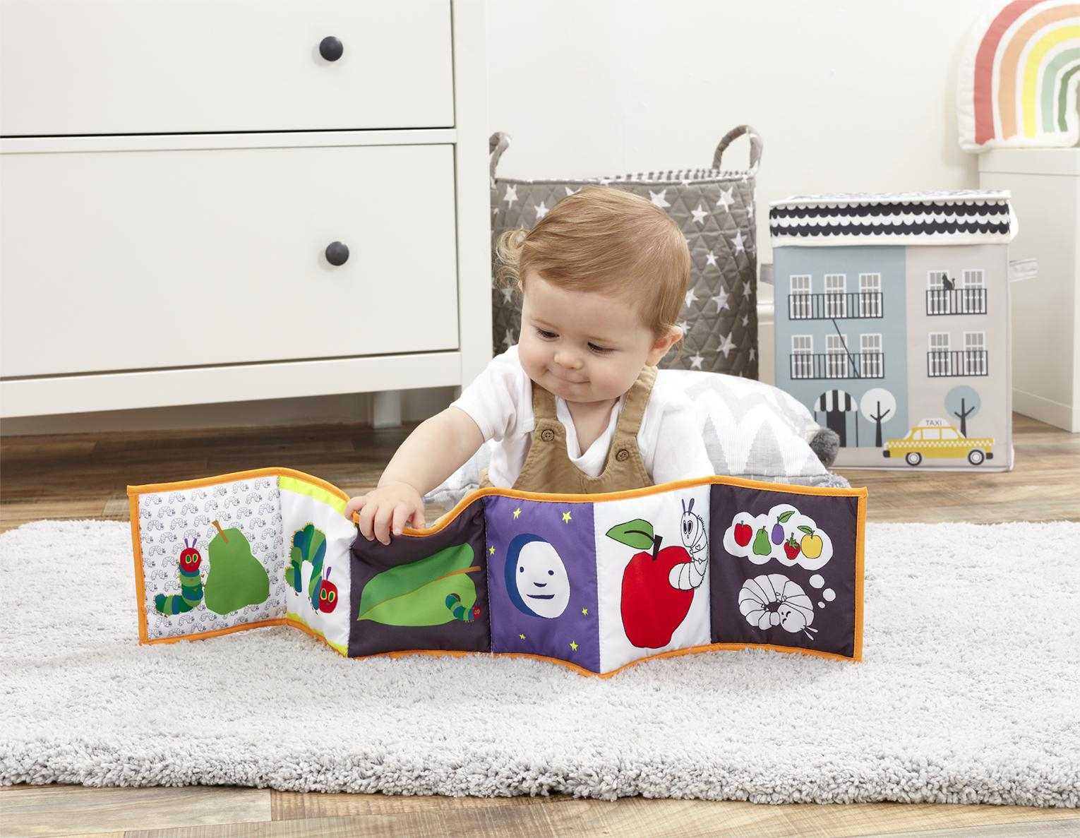 Jucarie textila Tiny & Very Hungry Caterpillar cu doua fete pentru dezvoltare senzoriala