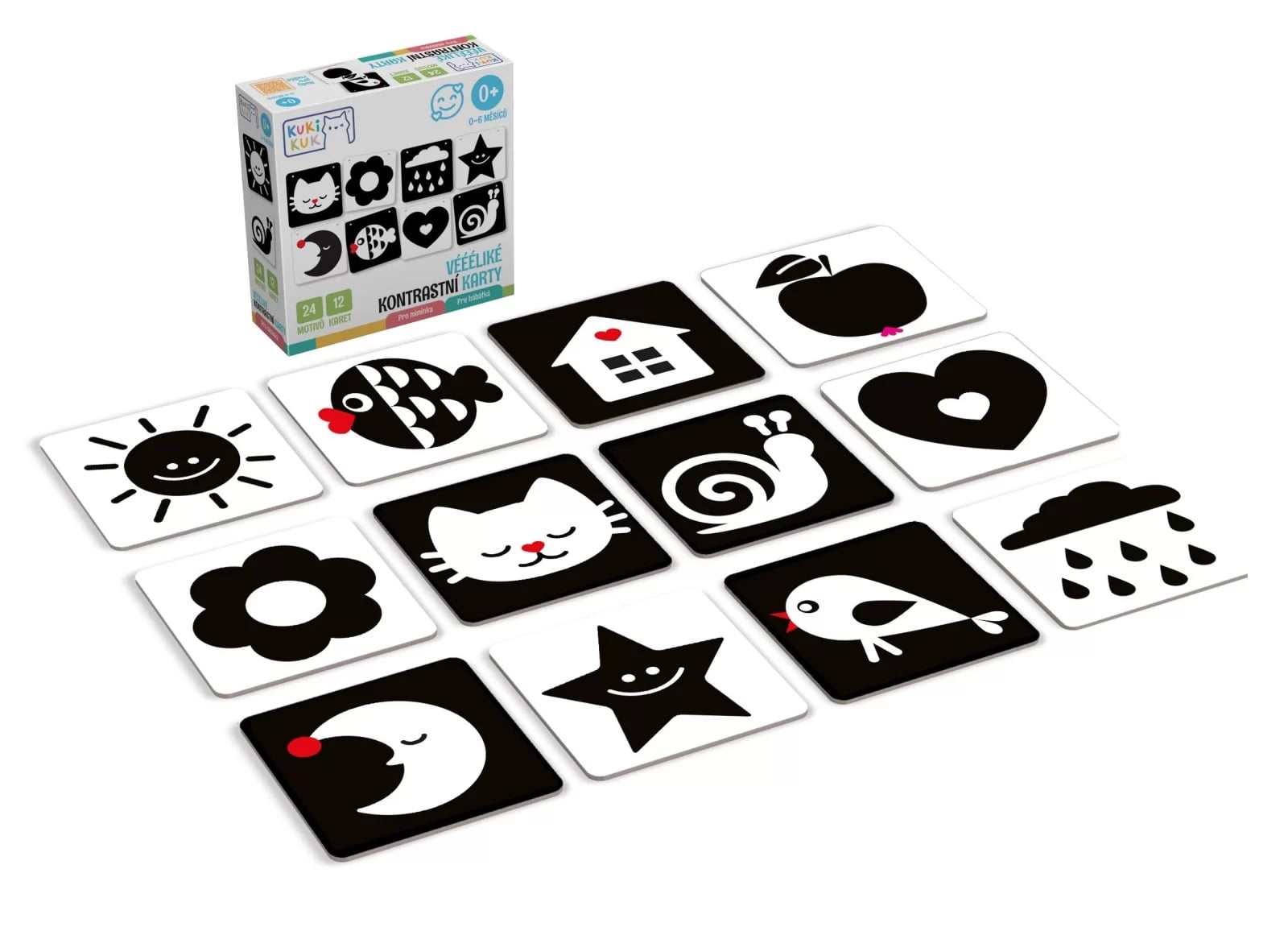 Joc educational pentru bebelusi, Flash Contrast Cards, Carduri alb-negru pentru acuitate vizuala, KuKiKuk Efko, 12 piese, 24 imagini mari contrastante, carton gros, varsta 0-6 luni