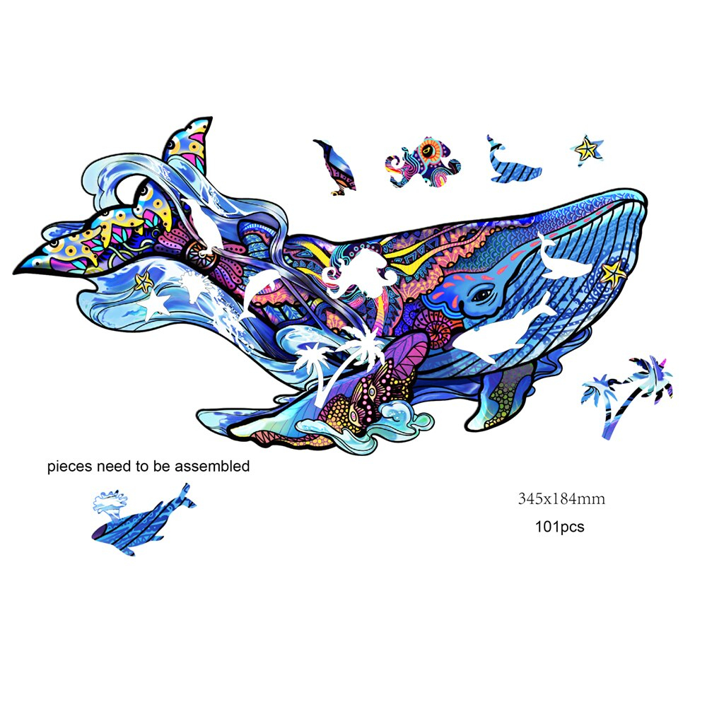 Puzzle din lemn multicolorat - Balena albastra, 125 piese