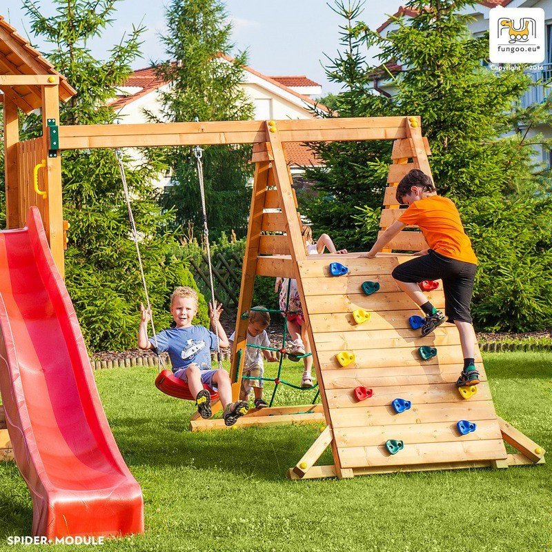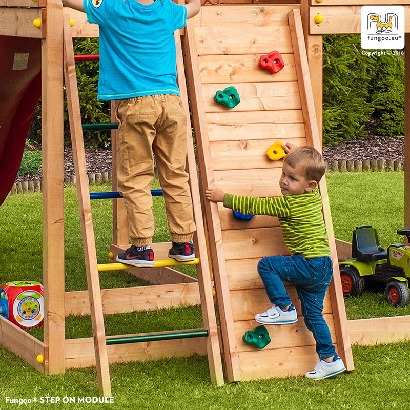 Spatiile de joaca�Fungoo sunt realizate din lemn natural intreg fara adeziv.Materialul lemnos are diametrul de 10 cm, este impregnat impotriva ciupercilor, a mucegaiului si a insectelor.Complexul de joaca este recomandat pentru uz rezidential, si se poate folosi de 12 copii� in acelasi timp.