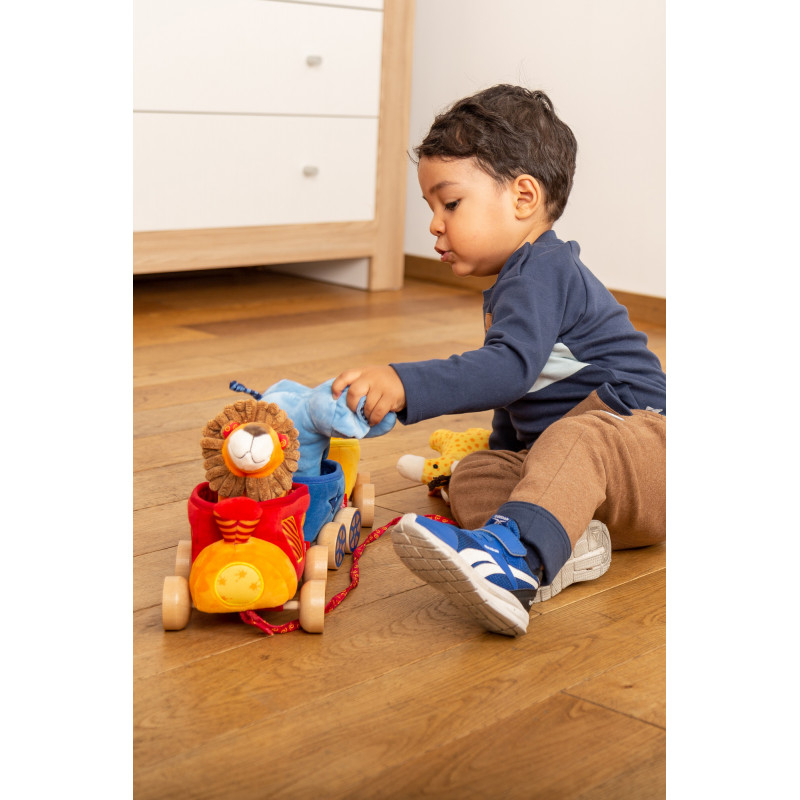 Trenuletul safari din plus cu animalute de la sigikid exploreaza noi teritorii alaturi de micul tau explorator. Elefantul, girafa si leul pot fi scosi din vagoane si ofera multe optiuni de joaca chiar inainte de prima aniversare, datorita zornaitorii si jucariei care scartaie. Rotile din lemn sunt atasate cu arici si pot fi indepartate pentru spalare.Programul PlayQ Baby Learning de la sigikid sprijina dezvoltarea bebelusilor in primele 12 luni, folosind jucarii textile interactive. Vederea, atingerea si auzul — jucariile din aceasta colectie de succes ii permit bebelusului tau sa le descopere cu toate simturile si sa invete prin joaca.Niciodata in viata un om nu invata atat de mult intr-un timp atat de scurt ca in primii ani de viata. Si niciodata parintii si bunicii nu au fost mai preocupati sa sprijine si sa insoteasca dezvoltarea copiilor si nepotilor lor. Sistemul PlayQ de la sigikid raspunde acestei dorinte cu produse frumoase, care stimuleaza intr-un mod jucaus si bland chiar si pe cei mai mici dintre noi.