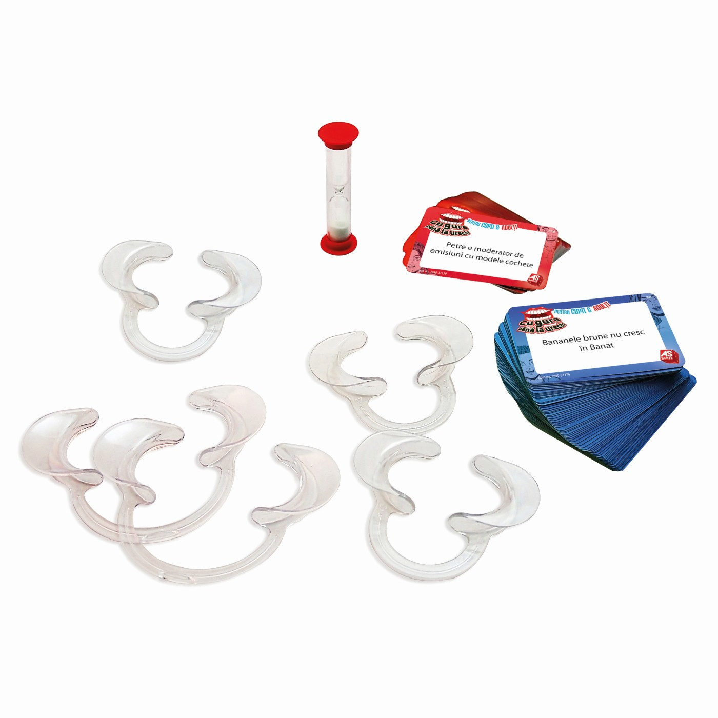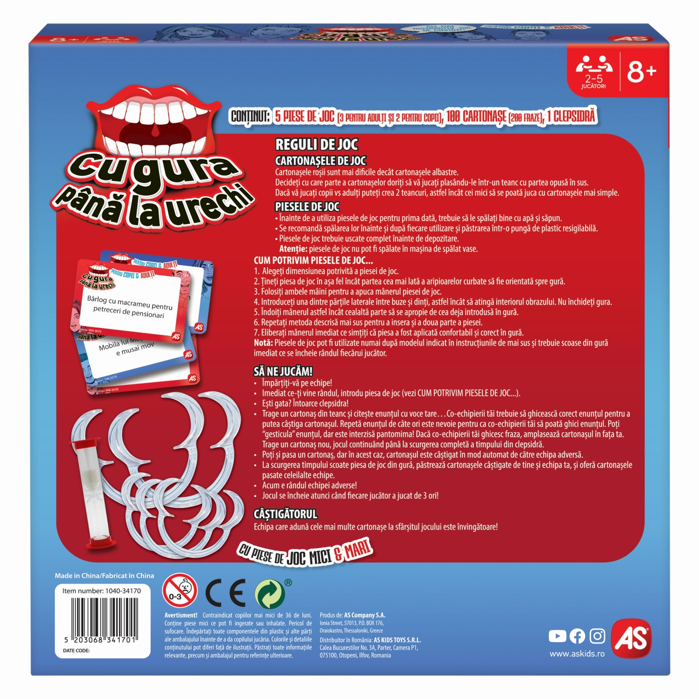 Pregateste-te de super distractie CU GURA PANA LA URECHI - jocul care aduce impreuna parintii si copiii, pentru o distractie pe masura. In procesul jocului, jucatorii trag un cartonas si incearca sa rosteasca fraza de pe acesta, avand in gura o piesa bucala ce nu le permite sa-si apropie buzele. Timpul din cronometru se scurge, in timp ce toti jucatorii incearca sa ghiceasca fraza pronuntata. Echipa care aduna cele mai mult cartonase la sfarsitul jocului castiga! Setul contine 5 piese bucale (3 pentru adulti si 2 pentru copii), un cronometru si 100 de cartonase fata verso cu 200 de fraze hilare. Varsta recomandata 8+.