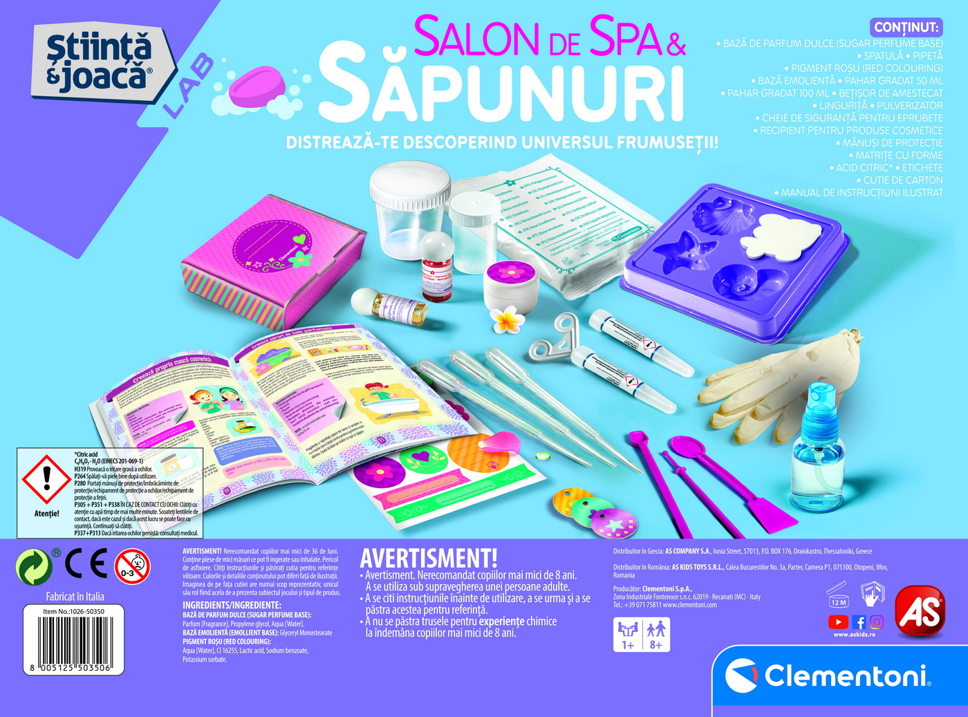 SPA & SAPUNURI AROMATE un laborator fantastic pentru crearea sapunurilor, gelurilor de dus si bombe de baie, pe baza de ingrediente naturale si absolut sigure. Copiii adora sapunurile parfumate iar acum pot experimenta cu crearea diferitelor sapunuri, bombe de baie, exfoliante de corp si crea un centru de SPA si relaxare acasa. Experimentele sunt absolut sigure! Setul contine baza de parfum dulce, pigment rosu, baza emolienta, pahare gradate, betisor de amestecat, lingurita, pulverizator, cheie de siguranta, manusi de protectie, matrite cu forme, cutie de carton, recipient pentru produsele cosmetice, acid citric si manual de instructiuni ilustrat. Valorile dezvoltate Logica, Coordonarea mana-ochi, Gandirea, Creativitatea, Imaginatia, Sociabilitatea. Varsta recomandata 8+.
