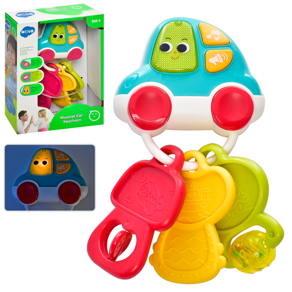 Masina are un design de inalta calitate, detaliat. Jucaria muzicala este vopsita in culori pastelate placute, combinate armonios intre ele. Cheia rosie cu o inima rotativa este decorata cu o imagine a unui avion. Cheia galbena de dentitie este realizata din cauciuc de inalta calitate, cu o suprafata texturata , in forma cu o barca turnata. Cheia de culoare verde deschis este decorata cu un model de masina de scris si este echipata cu o minge rotativa cu margele mici multicolore. Trei butoane functionale de pe tabloul de bord al masinii muzicale se activeaza atunci cand sunt apasate lumina de fundal stralucitoare sunete amuzante melodii amuzante Jucaria este realizata din plastic de inalta calitate, cu durabilitate excelenta si rezistenta la deteriorari mecanice. Materialul este hipoalergenic si complet sigur pentru sanatatea copiilor.