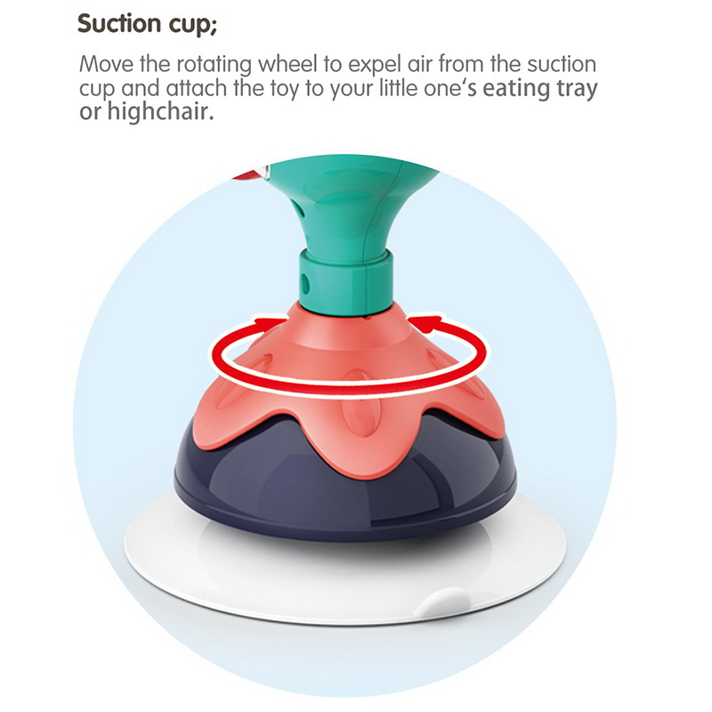 Jucaria Bebe Paun cu ventuza are parti mobile, texturi variante, culori diferite pentru stimulare vizuala si un design versatil si atragator. Jucaria se poate monta masa copilului, pe scaunul lui de masa, pe parchet sau alte suprafete plane. Jucaria are 5 locuri, in care copilul poate efectua diferite activitatii precum rotirea, tragerea, apasarea, etc.