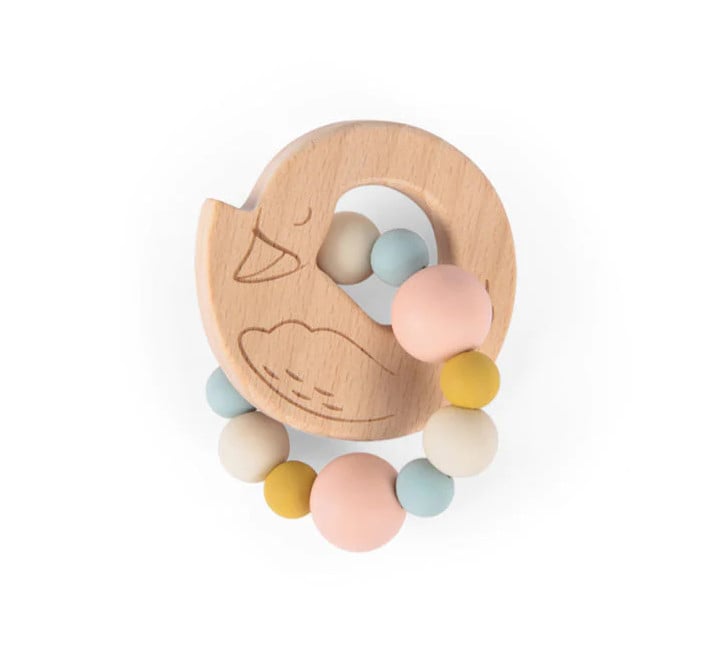 Inel de dentitie Lebada O jucărie din lemn și silicon care va însoți zilnic bebelușul. Bimaterial, îi permite bebelușului să aleagă ce îi va alina cel mai bine gingiile dureroase. Cu forma sa rotunjită, este ușor de apucat de mâinile mici. Bebelușul va putea să-l ridice și să-l scuture cu ușurință. Un superb cadou de naștere pentru bebeluși fete sau băieți. Ambalat în cutie de carton. Dimensiuni jucărie: 10 x 8 cm. Vârsta recomandată: +0 luni. Material: lemn de fag și silicon. Se curăță cu o cârpă moale și umedă. Producător Moulin Roty, Franța.