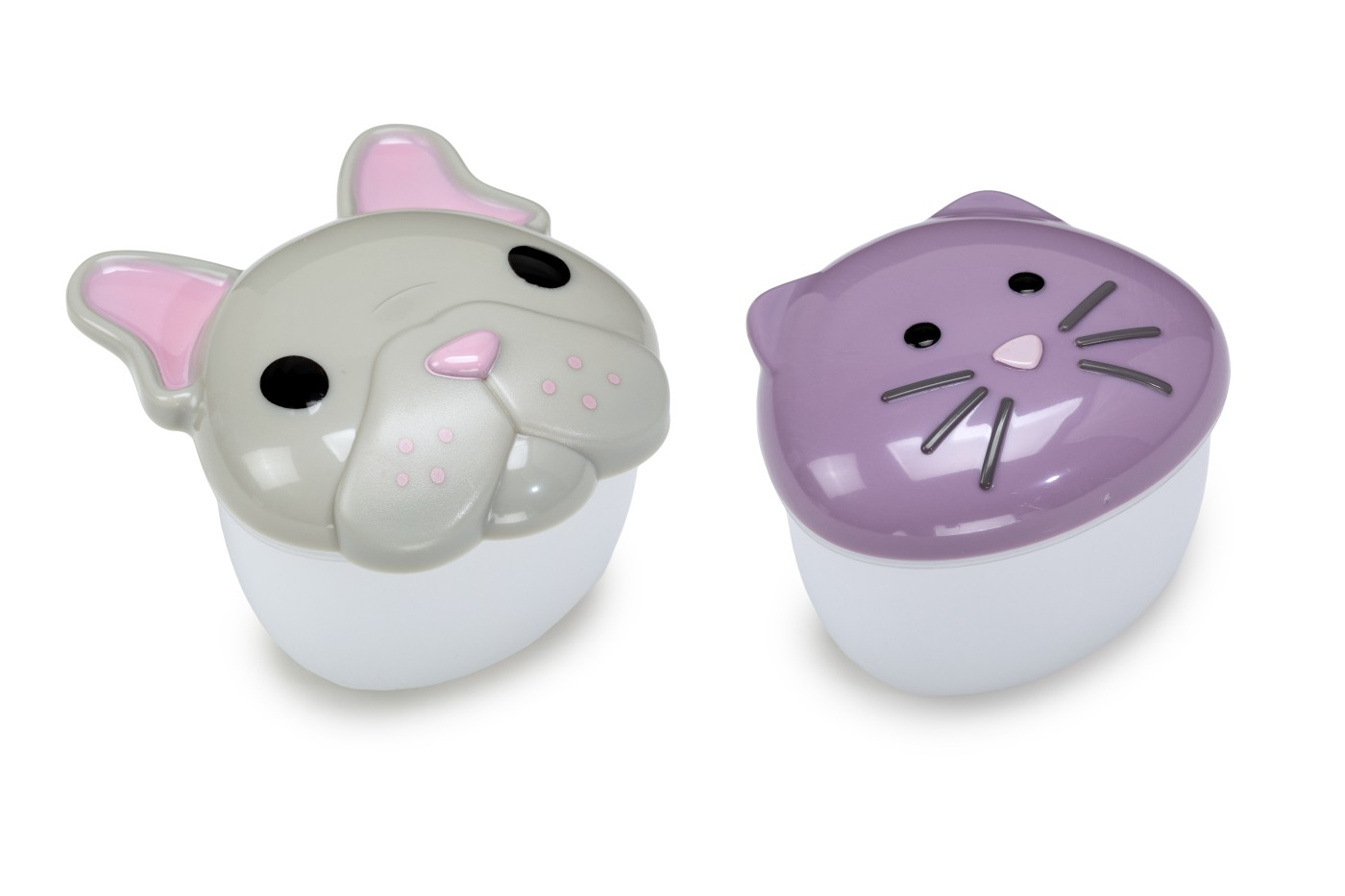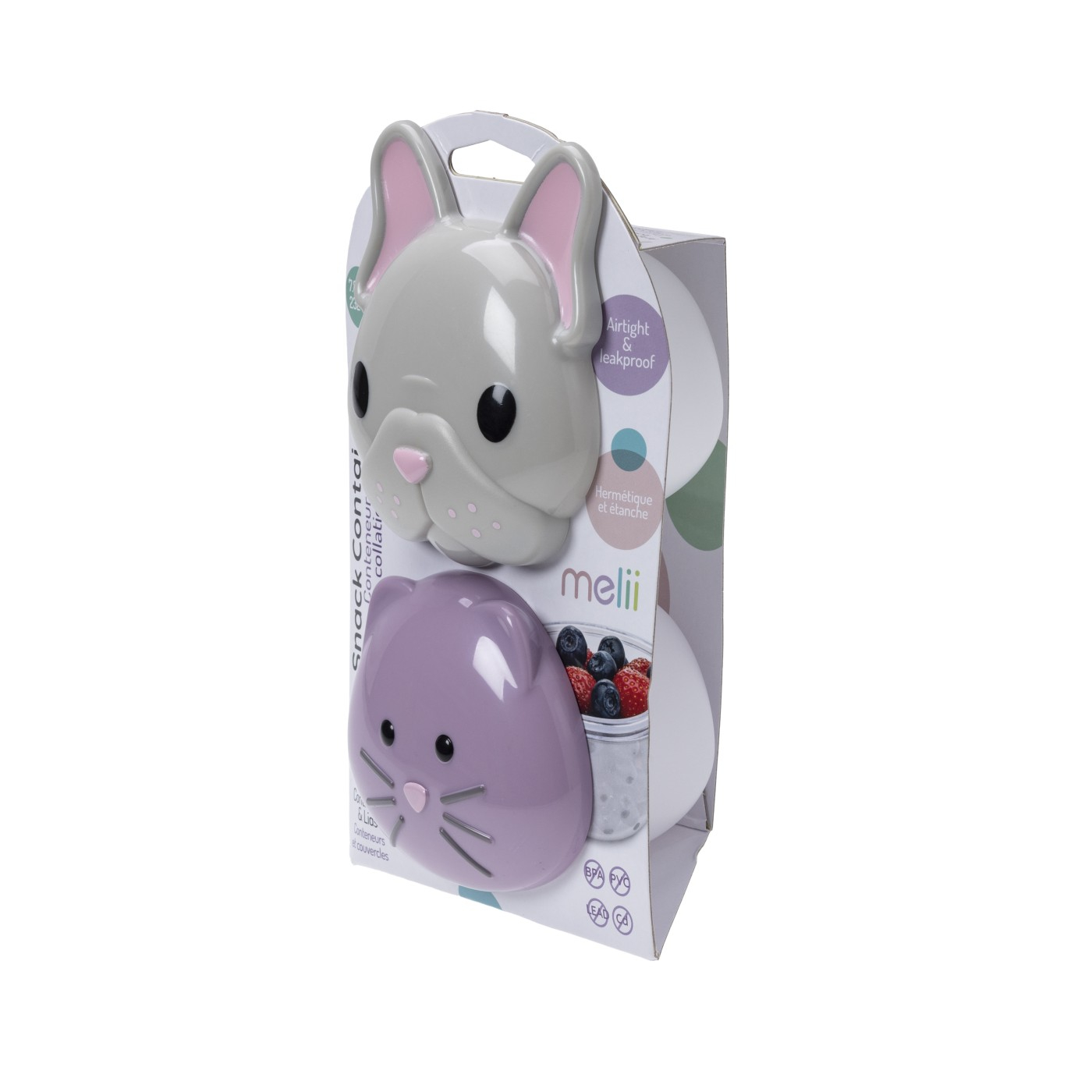 Set 2 recipiente hrana bebe, Melii, model bulldog+pisica Cu recipientele de gustari in forma de animale Melii, copiii pot transporta si depozita gustarile intr-un mod adorabil! Acest set de 2 recipiente de mancare, cu capac bulldog si pisica, de dimensiuni potrivite pentru copii, face gustarile distractive si au, in acelasi timp, un capac ermetic si antipicurare pentru a preveni mizeriile. Recipientele de hrana bebe, Melii, cu capace bulldog si pisica sunt fabricate dintr-un corp durabil si transparent pentru a evalua usor cat de plin este recipientul, iar design-ul faciliteaza deschiderea si inchiderea. Disponibile in 6 modele amuzante cu animale, aceste recipiente pentru gustari sunt perfecte acasa, in miscare in geanta pentru scutece si chiar pentru gustari portionate intr-o cutie de pranz! CARACTERISTICI PRODUS Capac ermetic si antipicurare pentru a preveni mizeriile Durabil si usor Usor de curatat si sigur in masina de spalat vase pe raftul superior Fara BPA, plumb, PVC, cadmiu, ftalati Capacitate de 232 ml/7.84 fl oz