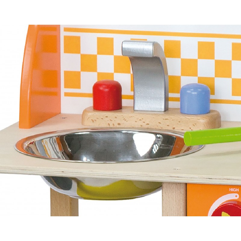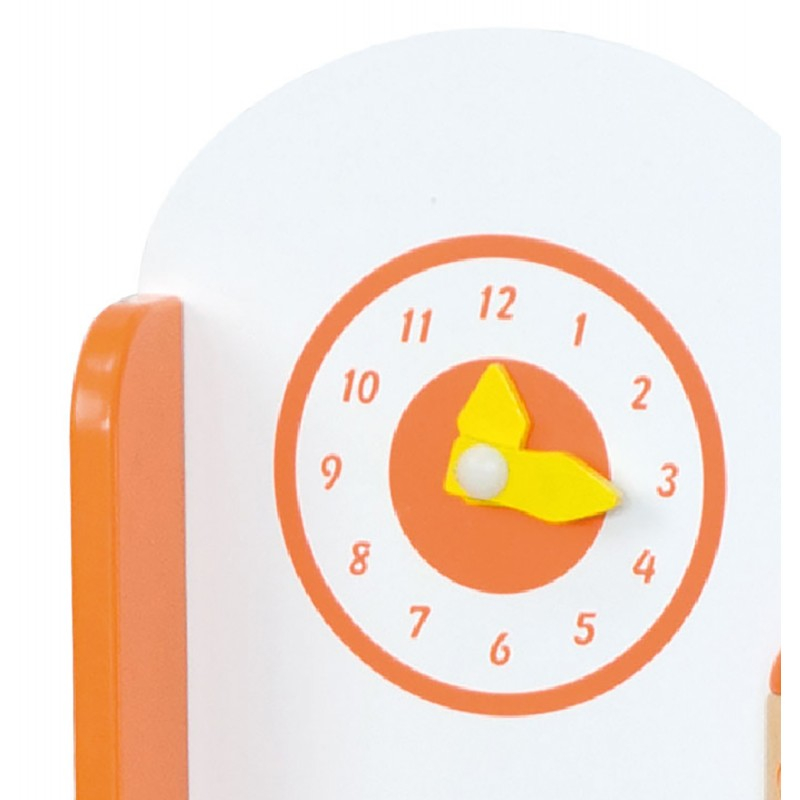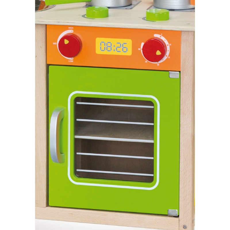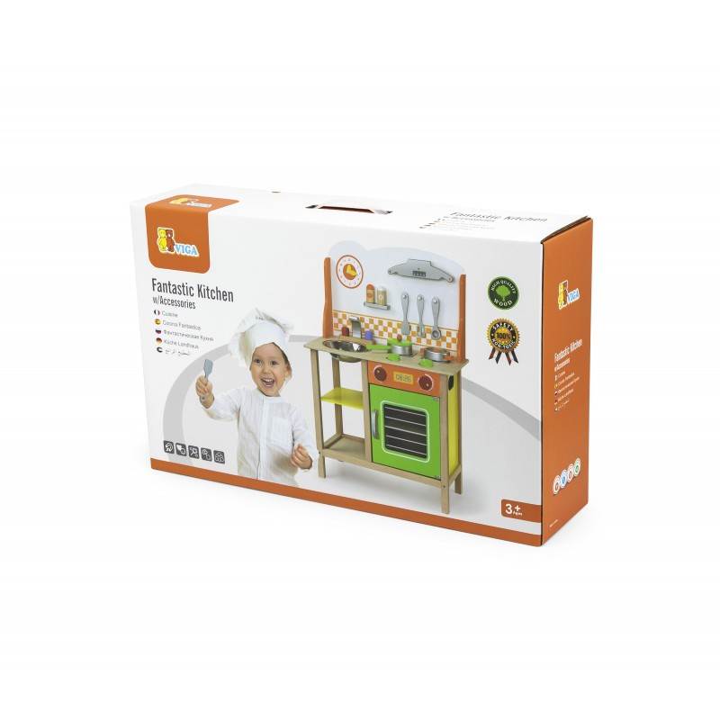 Bucataria fantastica contine o chiuveta, un aragaz, un cuptor cu ceas si un ceas de perete. Accesorii: o lingura, doua spatule diferite, doua borcane de condimente, o tigaie de prajit si o oala cu capac. Jucarie educativa din lemn, Montessori.