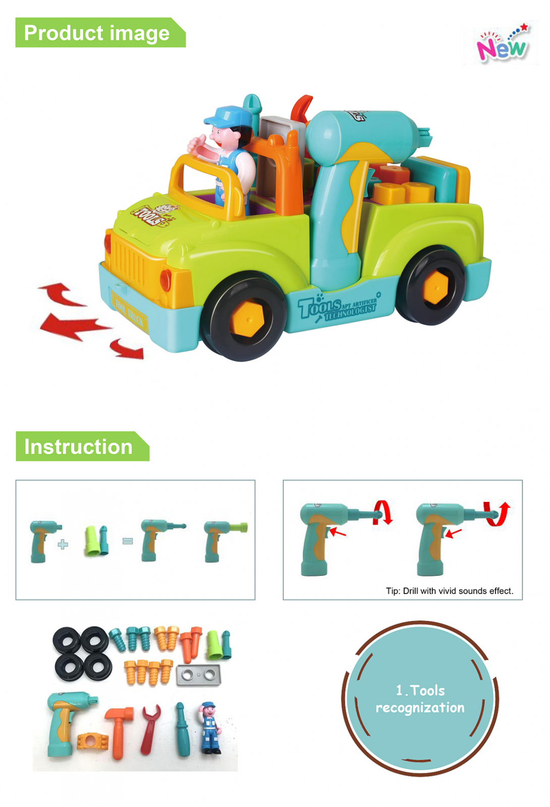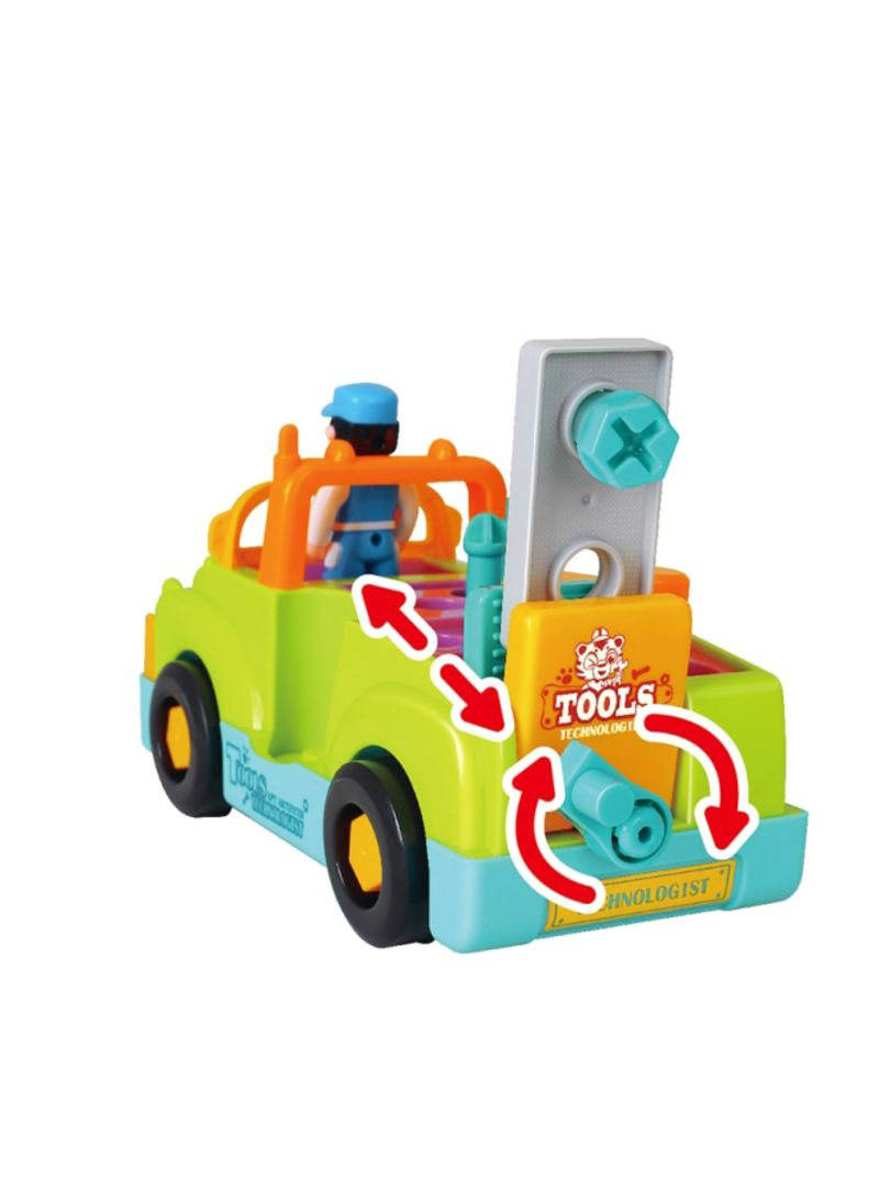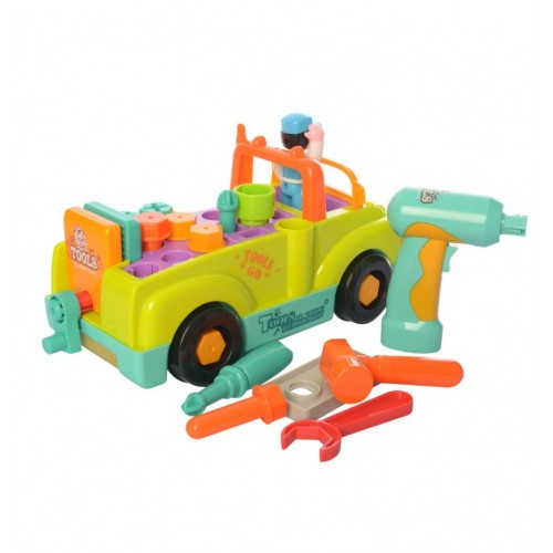 Aceasta jucarie este echipata cu patru unelte diferite, un burghiu motorizat ( pe baterii) si cu sunete, un ciocan, o cheie si o surubelnita si mai multe accesorii. Toate acestea pot fi schimbate pentru a fixa autovehiculul sau pentru a le folosi pe accesoriile care vin impreuna cu utilajul de transport uzinal. Unele accesorii sunt suruburi si unghii, dar toate pot fi aranjate in compartimentele pentru camioane. Jucaria are, de asemenea, un sofer de camion dragut care poate fi inlocuit si modificat pentru un alt personaj. Farurile camionului se pot aprinde si lumina in intuneric. Camionul poate fi asamblat si dezasamblat in timp ce se asculta muzica.
