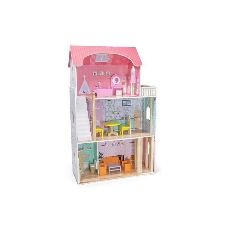 Aceasta casa de papusi din lemn cu pereti deschisi vine in culori dragute, ceea ce o face o optiune atragatoare pentru fete.