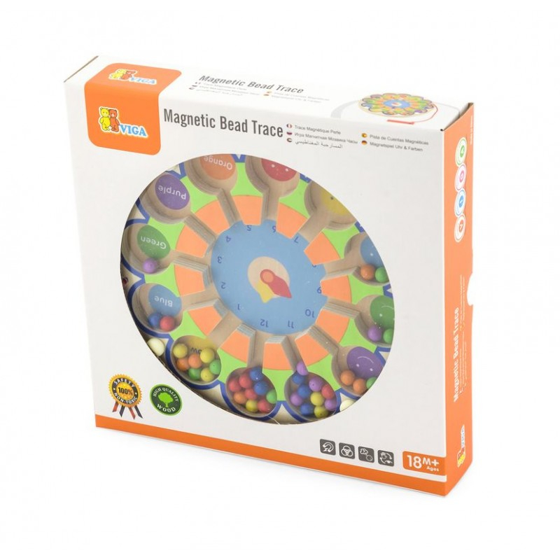 Trebuie doar sa folositi stick-ul magnetic pentru a muta bilele colorate astfel incat sa umpleti locurile corespunzatoare numerelor, asociate fiecare cu o anumita culoare. Bilele sunt inchise sub un ecran transparent. Puzzle-ul este din lemn si contine 1 stick magnetic care poate fi folosit la invatarea si scrierea numerelor. Jucarie educativa din lemn, Montessori. Dimensiuni: 17,5 x 17,5 x 1,3 cm (Lungime x Latime x Grosime). Jucaria este destinata copiilor avand varsta de 18 luni sau mai mult.
