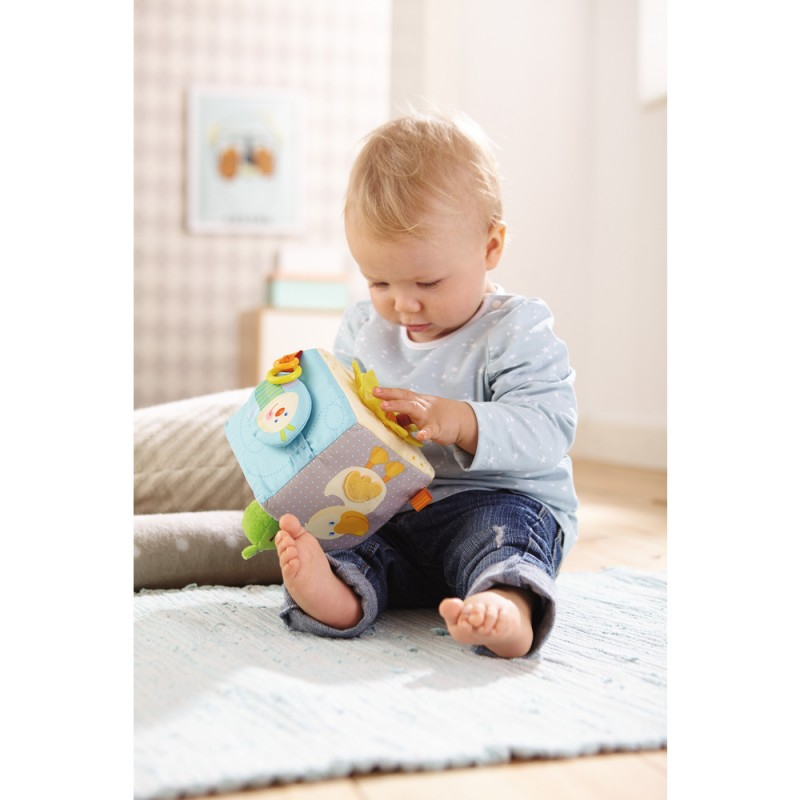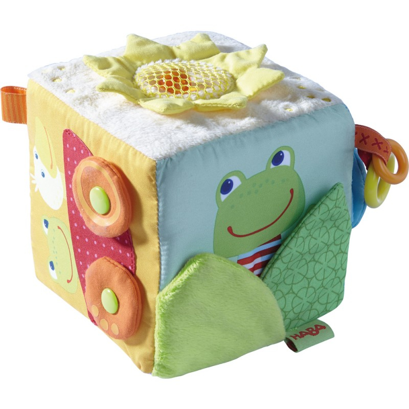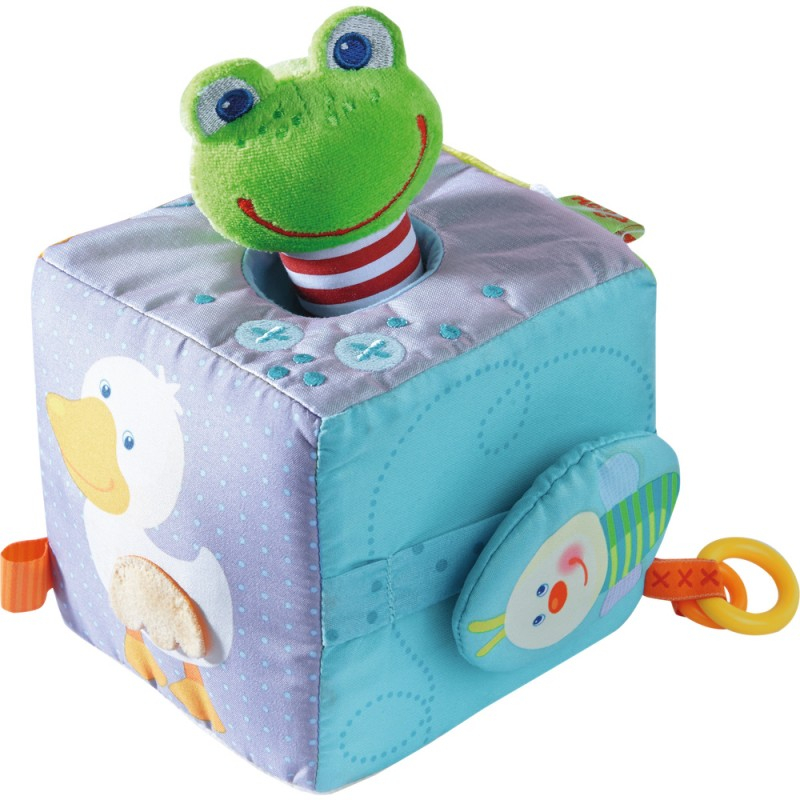 include multe elemente interesante de descoperit  prezinta o broasca magica saritoare O lume de explorat: rotile masinii se invart, burta ratei ascunde un scartait secret si broasca magica sare inapoi atunci cand este trasa afara si eliberata. Varsta recomandata: de la 6 luni Material: poliester