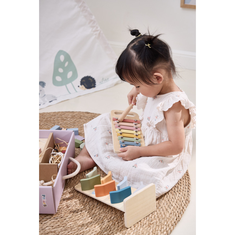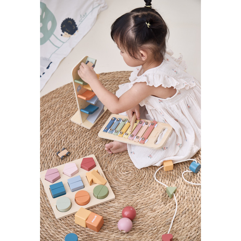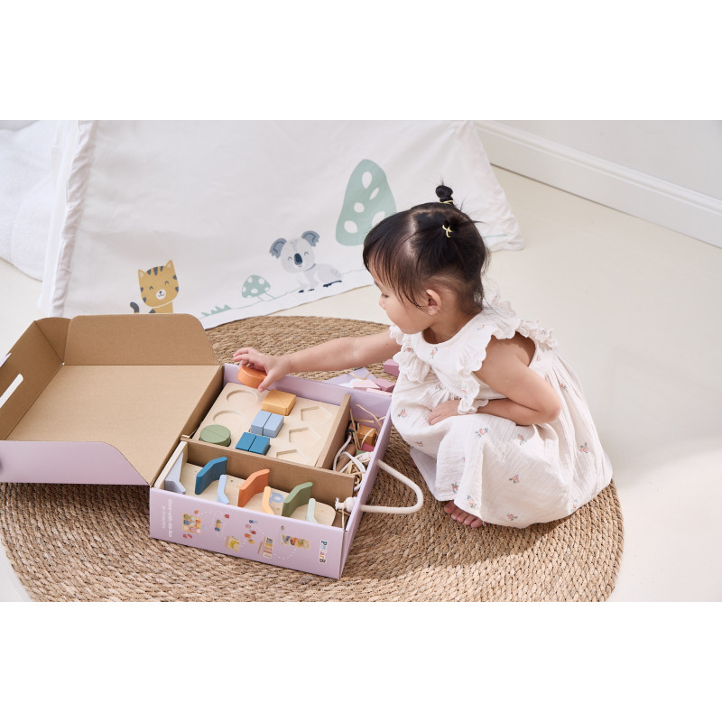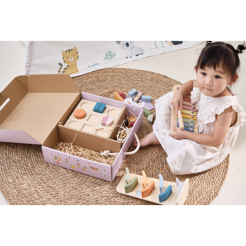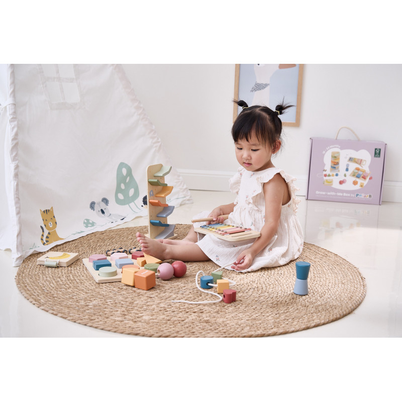 Cutia "Grow-with-Me" – jucaria potrivita la momentul potrivit!Conform filozofiei noastre, am creat colectia Grow-with-Me Box, un set de jucarii educative special conceput pentru a sprijini invatarea si dezvoltarea copiilor in fiecare etapa esentiala a cresterii lor. Hai sa ne jucam cu forme si culori!La aceasta varsta, copilul tau descopera tot mai multe despre lumea inconjuratoare! Aceasta cutie contine jucarii care ii provoaca curiozitatea, il ajuta sa-si dezvolte ritmul, dexteritatea degetelor, recunoasterea formelor si culorilor, dar si sa inteleaga primele concepte de fizica si relatia cauza-efect.Ritm si sunete cu XilofonulDo-Re-Mi-Fa-Sol-La-Si-Do! Muzica a fost mereu o parte importanta din viata noastra, iar pentru copii are un rol esential in dezvoltare. De la imbunatatirea abilitatilor cognitive la stimularea creativitatii, beneficiile sunt nenumarate! Xilofonul este jucaria muzicala perfecta pentru stimularea auzului si dezvoltarea interesului pentru muzica.Coordonare cu Pista de cursePregatiti, fiti gata, start! Niciun copil nu poate rezista acestei piste de curse super distractive! Alege o masinuta si asaz-o in varf, apoi priveste cum se rastoarna si aluneca pe nivelurile inferioare. Un joc captivant care poate fi repetat iar si iar, ajutand la dezvoltarea abilitatii de urmarire vizuala si oferind bucuria competitiei.Invartire cu Suruburi si piuliteRasuceste aceste piulite si suruburi supradimensionate! Fiecare piulita are un surub corespunzator in functie de forma si culoare. Prin acest joc, copilul invata sa sorteze si sa potriveasca culori si forme, isi dezvolta abilitatile motorii fine si isi imbunatateste gandirea logica si rezolvarea problemelor.Primele lecturi cu Cartea din lemn (Fructe)Aceasta este o carte minunata pentru ca cei mici sa descopere 8 fructe esentiale: banane, pere, pepeni, struguri, mere, piersici, mure si lamai. Dimensiunea portabila o face ideala pentru mainile micute, iar intoarcerea paginilor contribuie la dezvoltarea dexteritatii si a concentrarii.Motricitate fina cu Blocurile de insiruitInsirarea este o activitate excelenta pentru dezvoltarea abilitatilor motorii fine si a dexteritatii degetelor, esentiale pentru activitati ulterioare precum scrisul sau legatul sireturilor. Aceasta jucarie contine 4 blocuri geometrice usor de prins, cu gauri mari pentru insirare si un siret cu capete rigide pentru o manevrare usoara. Perfecta pentru primele exercitii de insirat!Recunoasterea formelor cu Puzzle-ul de blocuriAcest puzzle educativ ii ajuta pe cei mici sa recunoasca formele si culorile intr-un mod intuitiv si distractiv. Pentru a completa puzzle-ul, copilul trebuie sa potriveasca corect piesele, dezvoltandu-si gandirea logica. De asemenea, poate amesteca si combina piesele pentru a-si folosi imaginatia! Aceasta este jucaria perfecta pentru introducerea conceptului de „parte si intreg.” Descopera magia jucariilor educative si jucariilor Montessori, create special pentru a sprijini dezvoltarea armonioasa a bebelusului tau prin joaca inteligenta! Dimensiuni: 25 x 25 x 5 cm Varsta recomandata: 18 - 24 luni *AVERTISMENT! Contraindicat copiilor mai mici de 18 luni. Toate jucariile marca VIGA sunt fabricate din lemn de calitate cu vopsele si cerneluri non-toxice, supuse testelor de siguranta respectand standardele pentru jucarii ale Uniunii Europene EN71 si ASTM. Nu lasati ambalajul produsului la indemana copiilor. Indepartati orice ambalaj al produsului inainte de a da jucaria copilului. Va recomandam sa supravegheati copilul in timp ce se foloseste produsul. Pastrati instructiunile si etichetele pentru referinte viitoare. Feriti produsul de foc, temperaturi ridicate si umiditate.