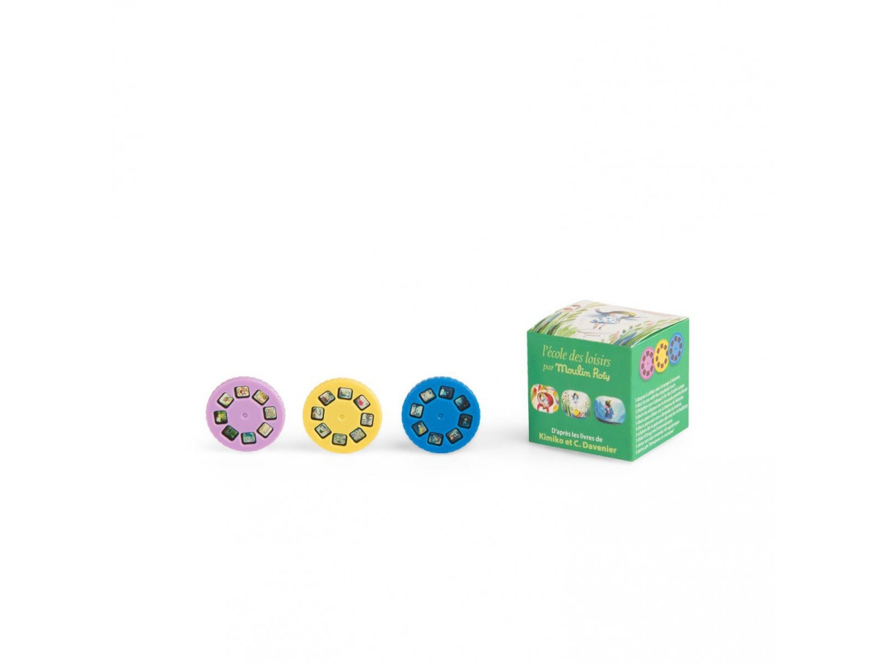 Rezerve pentru lanternă cu poveşti Conține 3 discuri cu ”diapozitive”, fiecare conținând 8 imagini cu povești din colecția Ecole de loisirs . Distrează-te inventând o lume de basme împreună cu copilul tău. Compatibile cu orice model de lanternă Moulin Roty. Dimensiuni: 4.5 x 4.5 x 4.5 cm Vârsta recomandată: + 4 ani. Confecţionate din plastic, conform reglementarilor EN71&ASTM. AVERTISMENT! Contraindicat copiilor sub 3 ani, conţine piese mici, pericol de înghițire. A se folosi sub directa supraveghere a unei persoane adulte. Citiţi cu atenţie eticheta înainte de a înmâna jucăria copilului. Producător: Moulin Roty, Franța.