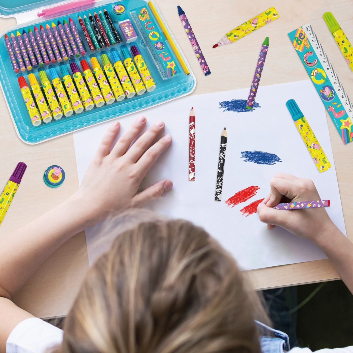 Art Case insoteste copiii pretutindeni, oferindu-le posibilitatea de a desena, picta si crea. Prin acest proces copilul va putea invata culorile si nuantele, formele si notiunea de marimi. Setul este o idee de cadou perfecta pentru fiecare copil care iubeste distractia creativa si care si-ar dori un set mobil de desen, pentru a-si imbunatati abilitatile creative. Valori dezvoltate creativitate, coordonare mana-ochi, capacitate de concentrare si rabdare.Contine12 creioane colorate, 12 markere,6 creioane de culoare,1 creion,1 rigla,1 radiera, o ascutitoare. Potrivit pentru copiii de la 3 ani.