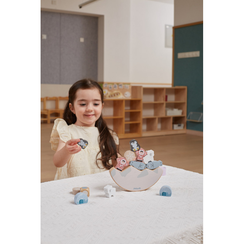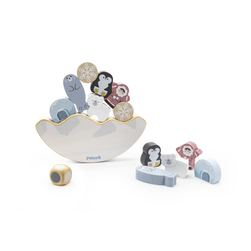 "Echilibrul Ghetarului Nastrusnic" - Jocul de echilibrare include 12 piese de blocuri din lemn, o baza si un zar.