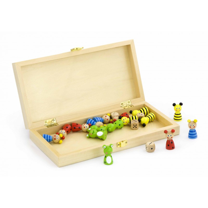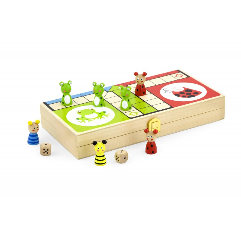 Un joc clasic Ludo pentru 2 pana la 4 jucatori. Deschideti cutia de lemn si intoarceti-o pentru a avea la dispozitie o tabla frumoasa de joc. Vine cu 16 jetoane de lemn (4 bucati din cele fiecare din cele 4 animale) si 4 zaruri. Ideal pentru joaca cu prietenii sau familia.