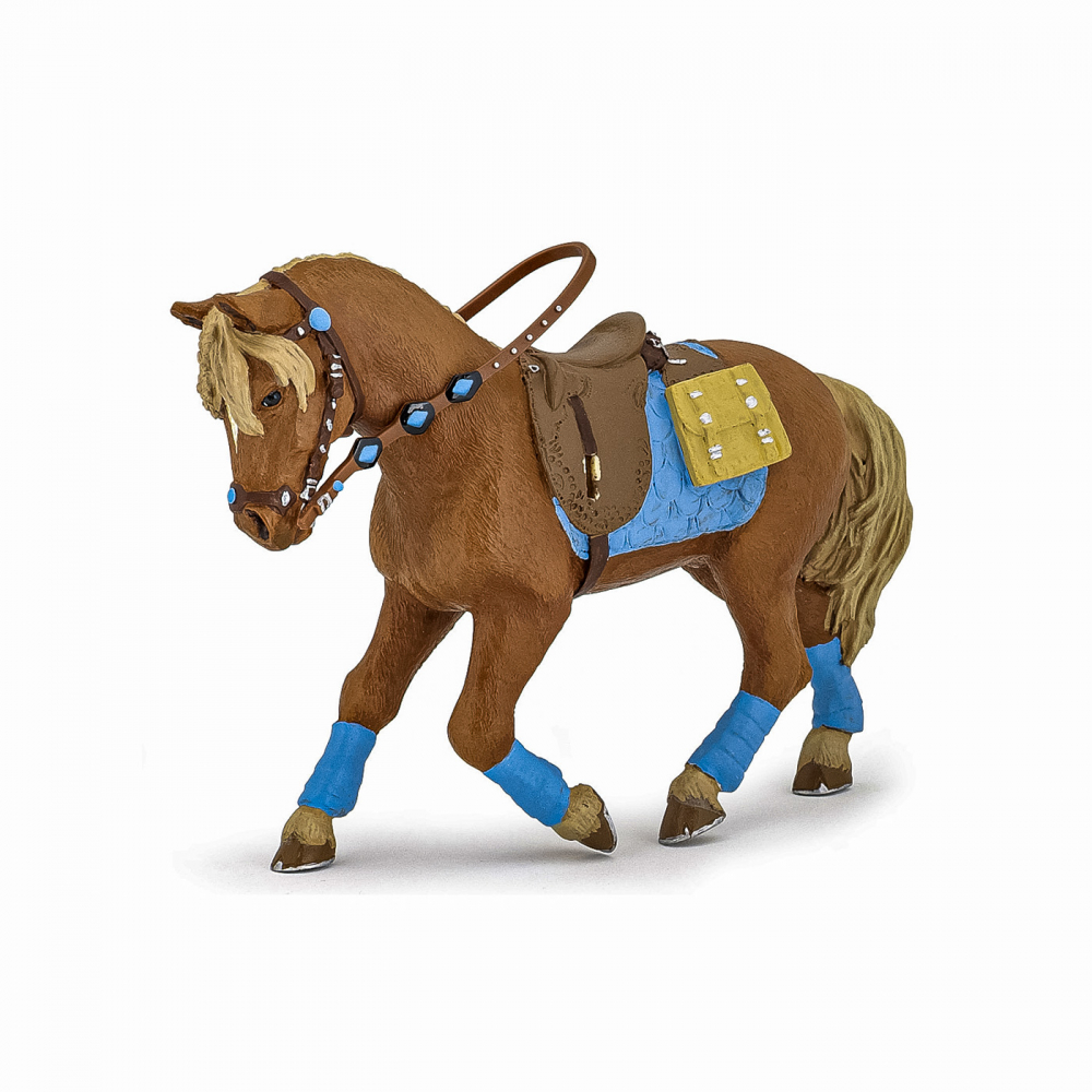 Faceti o plimbare prin campuri cu ecvinele Papo, participati la concursuri de sarituri sau chiar la cursuri de dresaj. Foarte elegant, cu sa albastra si benzile asortate, care ies in evidenta pe blana sa castanie, acest cal asteapta cu rabdare sosirea calaretului sau pentru a merge la o plimbare in padure. Produsul are urmatoarele dimensiuni 11.7 x 3.5 x 8cm si este recomandat copiilor cu varsta peste 3 ani. De mai bine de 20 de ani, Papo inoveaza constant si ii face pe copii din intreaga lume sa viseze cu o gama bogata de peste 600 de produse, reprezentand 12 lumi, animale si personaje. De la modelul original la serie, fiecare dintre figurinele Papo a fost conceputa si creata in Franta pentru a fi fabricata intr-o permanenta preocupare pentru calitate. Pictate manual, atentia la detalii este acum recunoscuta. Figurinele Papo se disting prin acuratete si realism, detaliile sunt de asa natura incat am putea crede ca se vor pune in miscare.
