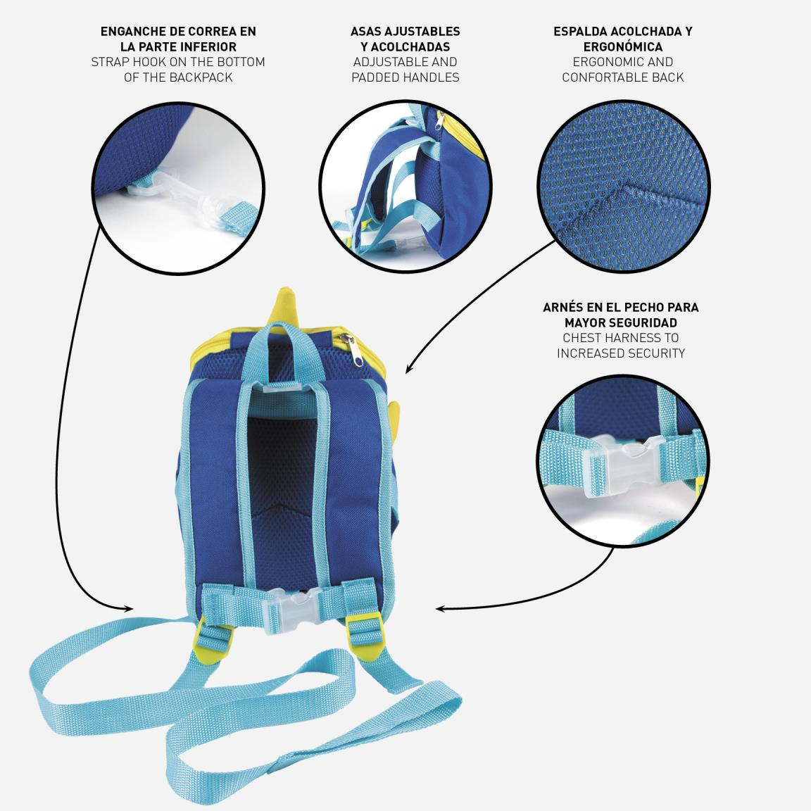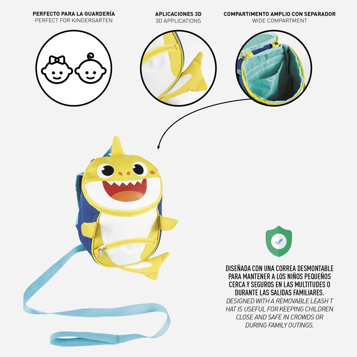 • Mini rucsac Baby Shark, prevazut cu ham pentru controlul celor mici.