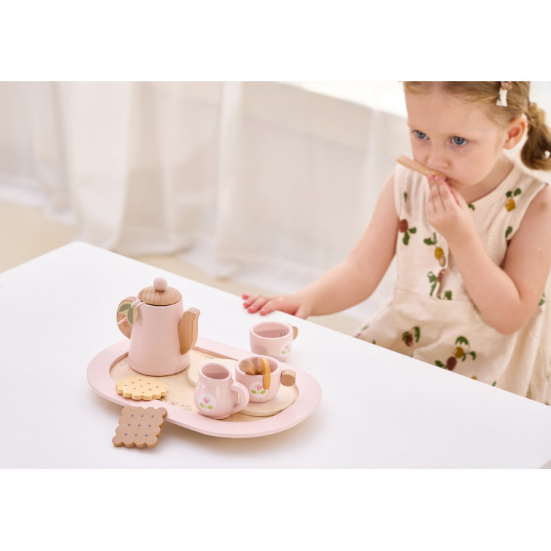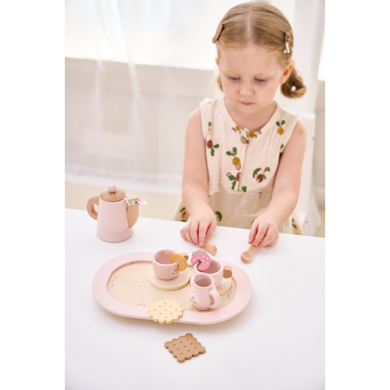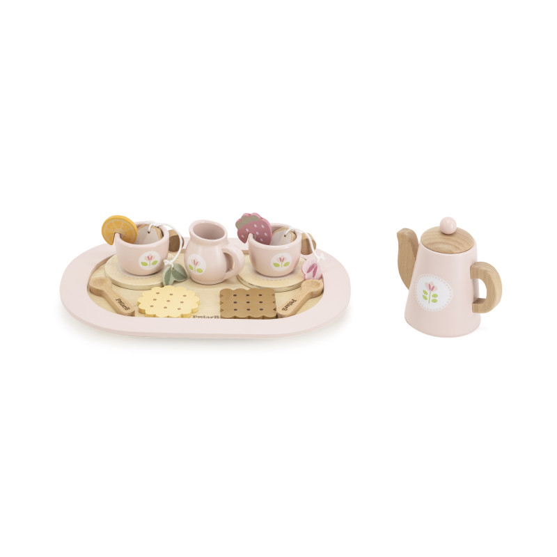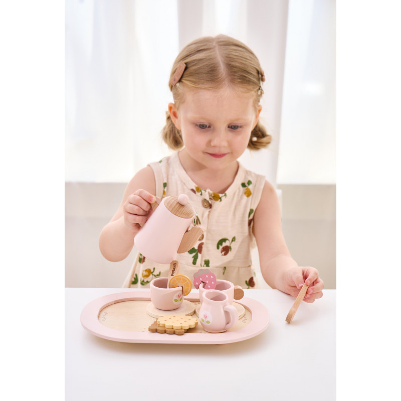 Set adorabil de ceai care va permite micutilor tai sa organizeze propria lor petrecere de ceai!Setul include: o ceainica, 2 cesti si suporturi, o sticla de lapte, 2 plicuri de ceai, 2 lingurite, o felie de lamaie, o felie de capsuna, 2 biscuiti si un tava pentru servire.