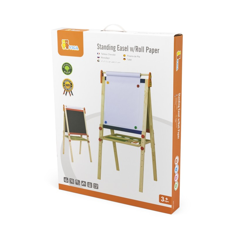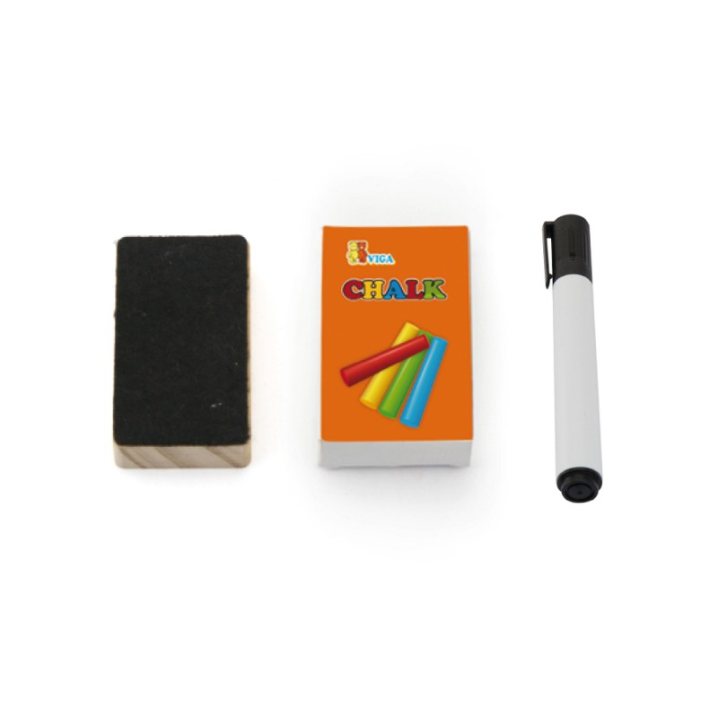 O tabla solida neagra pentru creta si o tabla alba magnetica, insotite de o cutie de creta, o radiera, un marker, 4 piese magnetice pentru fixarea hartiei, o rola de hartie cu lungimea de 10 metri.