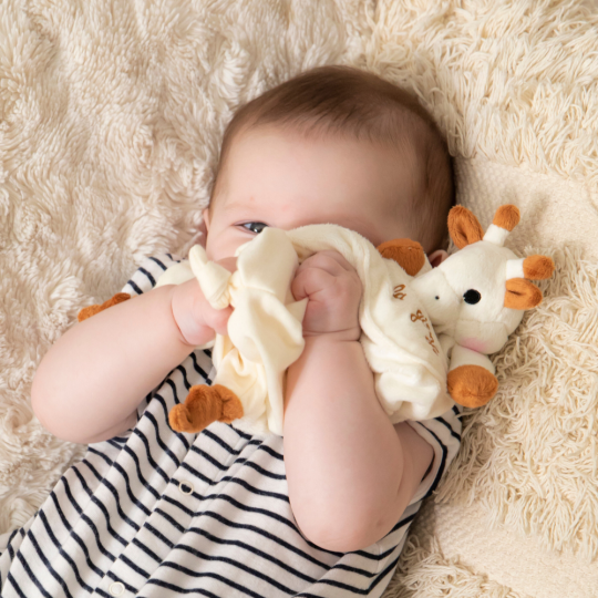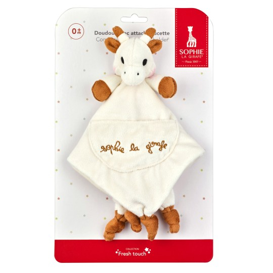 Acest doudou (comforter) practic, este dotat cu sistem de prindere velcro® pentru a atasa suzeta bebelusului si cu un buzunar , pentru un plus de igiena. Usor si special conceput pentru manutele mici ale bebelusului, datorita capului girafei si nodurilor ce se gasesc la fiecare extremitate. Dimensiunile generoase vor face din aceasta jucarie cel mai bun prieten al copilului dvs!