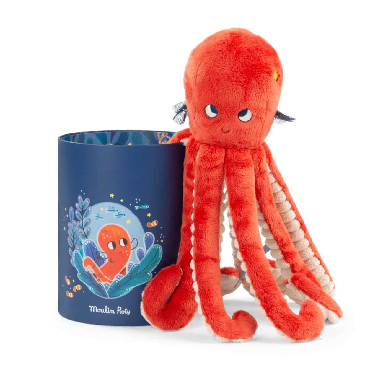 🐙 Polpo Paulie în cutie cadou – Moulin Roty Paulie este o caracatiță simpatică din colecția Sous la mer de la Moulin Roty. Cu tentaculele sale moi și culorile pastelate, devine rapid prietena preferată al celor mici. Ambalată într-o cutie cadou elegantă, decorată cu ilustrații marine. Detalii produs: Dimensiuni Paulie: 25 cm Materiale: Bumbac, poliester Culoare: Tonuri de albastru și verde Vârstă recomandată: 0+ luni Întreținere: Lavabil la mașină la 30°C, program delicat (fără uscare automată) 🎁 Beneficii: Recomandare cadou: Cutia decorativă pentru un dar memorabil pentru botezuri, aniversări sau baby shower-uri. Siguranță și confort: Materialele de calitate și designul atent asigură o experiență plăcută și sigură pentru cei mici. Prieten de nădejde: Paulie devine rapid tovarășul preferat al copilului, oferind confort și companie în fiecare moment. .