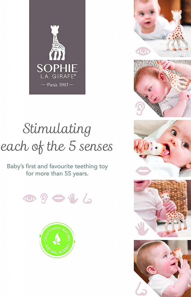 * Mirosul: mirosul aparte al cauciucului extras din arborele de Hevea o face pe Sophie sa fie usor de recunoscut de catre bebelus dintre toate jucariile sale.