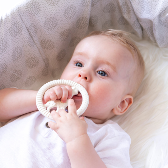 Inel dentitie girafa Sophie fabricat din cauciuc natural, non-toxic, fin, moale, excelent pentru calmarea durerilor cauzate de aparitia primilor dintisori. Cauciucul natural este extras din arborele de Hevea, fiind un material suplu si moale, ideal pentru un inel gingival. Inelul este usor de tinut in manutele bebelusului, datorita formei sale. Inelul are diferite texturi care vor masa gingiile dureroase ale bebelusului.