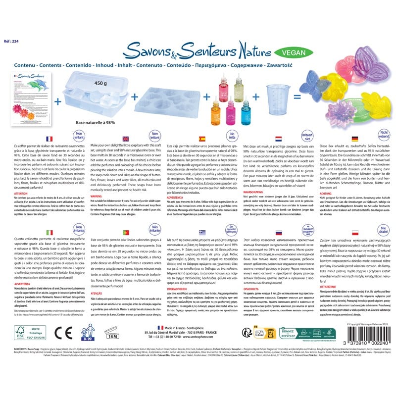 Conținutul setului: 450 g săpun cu glicerină 10 mulaje de forme diferite - elemente din natură 3 coloranți cosmetici 2 parfumuri cosmetice cu pipetă Instrucțiuni de utilizare.