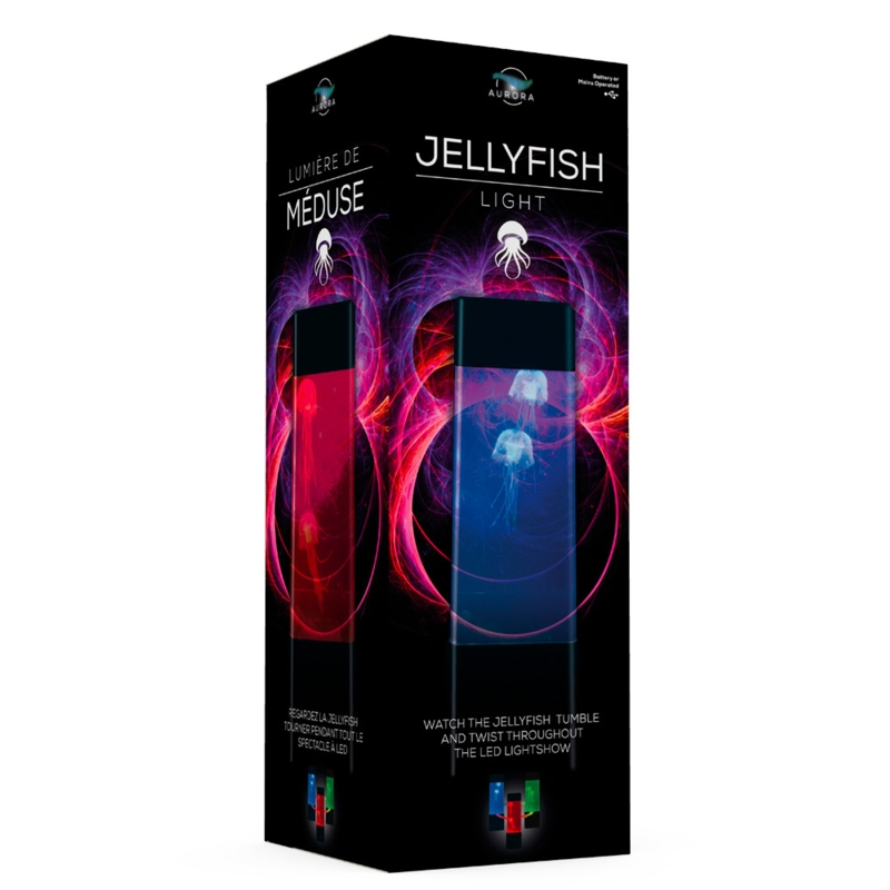 Lampa de noapte sau obiect de decor ce va va tine atentia ocupata pentru ore intregi. Functioneaza cu 3 baterii AA (neincluse) sau se poate folosi un alimentator (neinlcus). Jeturi de aer misca cele doua meduze in acvariul iluminat cu led-uri colorate.