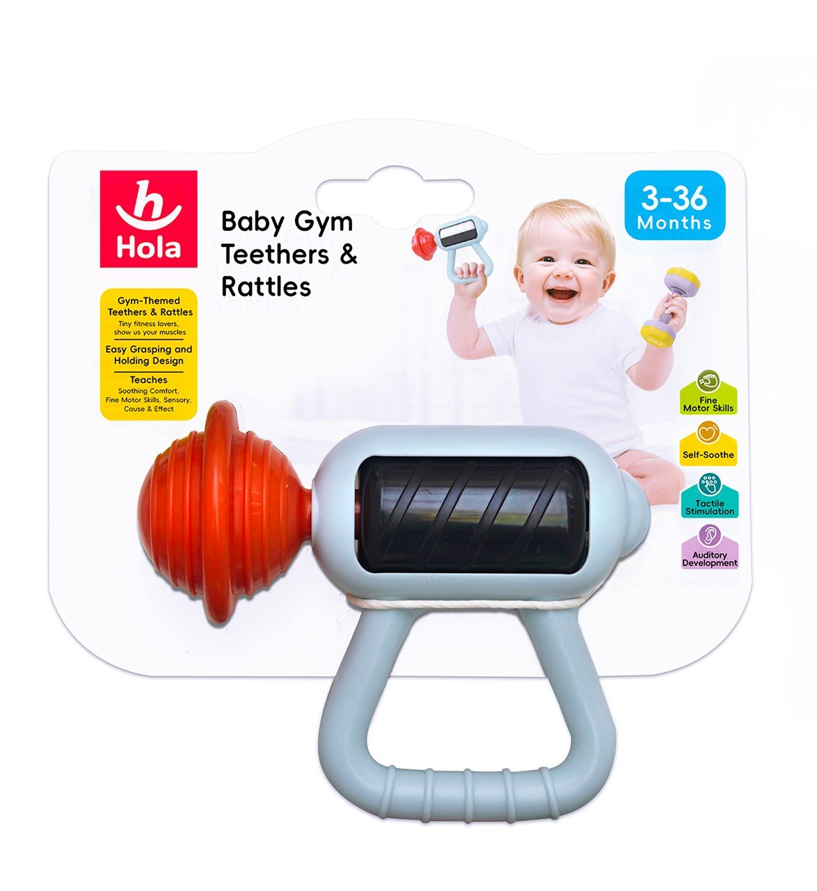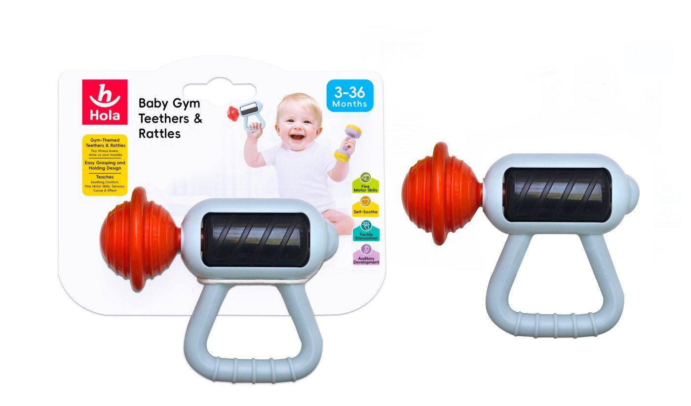 Jucaria de dentitie de la Hola este o optiune de cadou adorabila si distractiva pentru cei mici. Jucarie dentitie in forma de pistol de masaj. Acesta adorabila zornaitoare stimuleaza abilitatile motorii fine, descoperirea senzoriala si ii ajuta pe copii sa inteleaga cauza si efectul. Este usor de tinut in mana si de manevrat. Usor de dezinfectat.