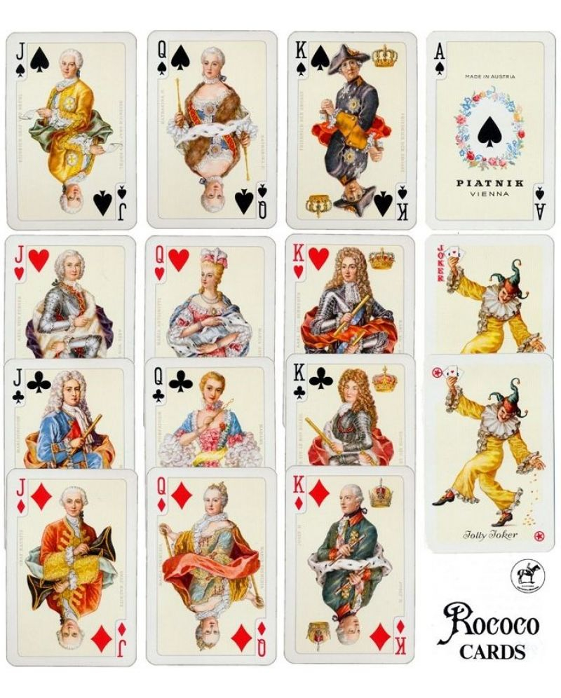 Set carti de joc de lux, 2 x 55 carti, cu ilustratii speciale, cu personaje din perioada Rococo, care este un stil artistic foarte ornamental si teatral, care combina asimetria, aurirea, culori albe si pastelate, aparut in Franta in secolul XVIII. Sunt ideale pentru toate jocurile cu carti: Canasta, Whist, Bridge, Poker, etc. Varsta recomandata: 7+ ani. Dimensiuni set: 9,5 x 13 x 2,5 cm.