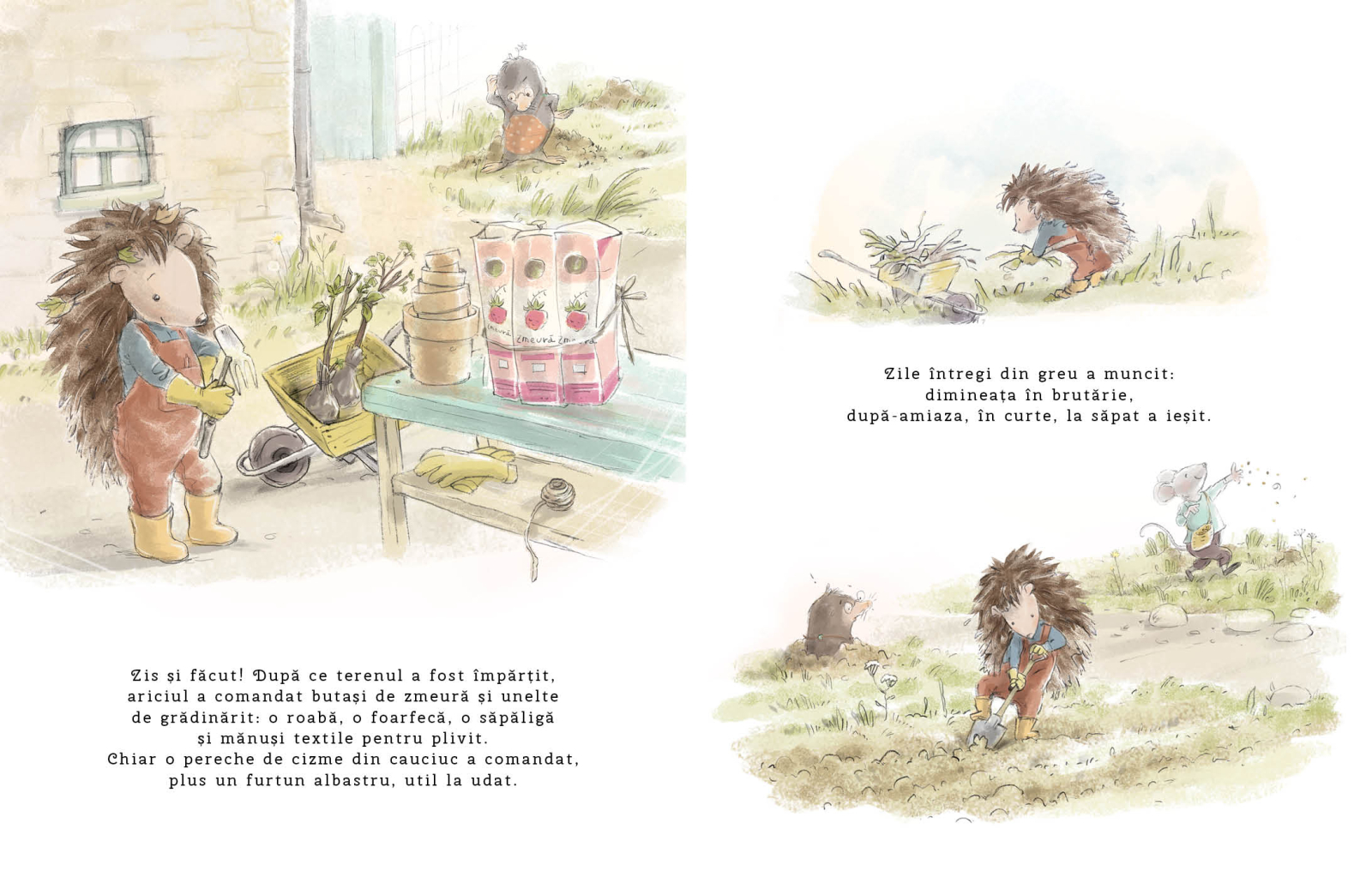 In aceasta carte este prezentata o poveste despre prietenie, soricelul Fursec si ariciul Agrisa planuiesc sa cultive fructe in propria curte, insa acestia se vor confrunta cu mici provocari. Copiii vor invata despre gradinarit, vor descoperi uneltele necesare acestei activitati, dar vor afla si despre importanta muncii, devotamentului, rabdarii si prieteniei._x000D_